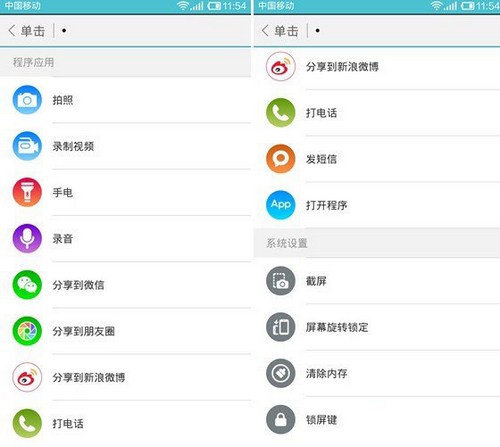目前米键的动作指令包括打开“程序应用”和“系统设置”,其中系统应用是手机系统的部分功能,包括截屏、清除内存等。而程序应用则能实现某些程序的动作操作,包括拍照、手电、录音,甚至是分享到微信、微博等。而且通过“打开程序”,还支持我们自定义添加很多手机中已经安装的第三方APP,如下图所示: