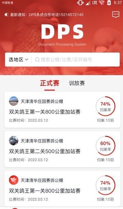 拍照摄影DPS公棚管理系统最新版是一款很专业的鸽子养殖行业类手机软件,用户们通过软件可以在线的进行赛鸽和管理,你可以随时的查找相关的比赛内容,其中包含了训放赛、正式赛两种,同时还可以选择不同的地区,比赛和足环编号以及公棚等,有需要的用户赶快下载使用吧!