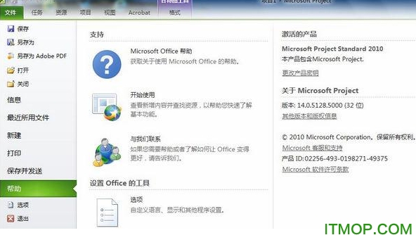 7、激活完成,我们打开microsoft project professional 2010界面,点击文件-帮助选项,可以看到已经破解成功