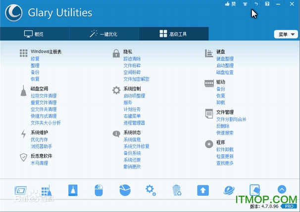 拍照摄影Glary Utilities(全能系统维护军刀)是一款专业的系统优化清理工具,可能一般用户都是用的是360安全卫士或者电脑管家对电脑进行管理,清理垃圾或者优化系统其实这些杀毒软件都不专业,Glary Utilities提供完整的解决方案,欢迎来IT猫扑网下载