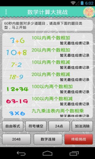 数学计算大挑战是一款集数学练习、拓展和趣味游戏为一体,锻炼数学计算能力的APP,它能帮助我们每天训练锻炼大脑,提高解决问题的能力。应用根据不同人群分为不同测试类型,适合任何年龄段用户使用,既有幼儿园升小学及中小学年龄段的孩子学习数学计算,也适合家庭成员间进行计算比赛。