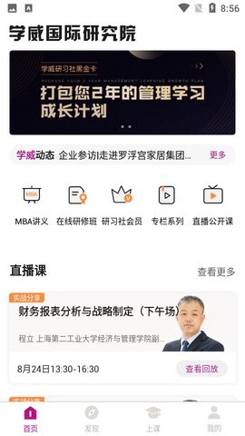 公开课:邀请名校教授、知名企业高管开展线上直播,不断提供给学员新的视野,新的知识;