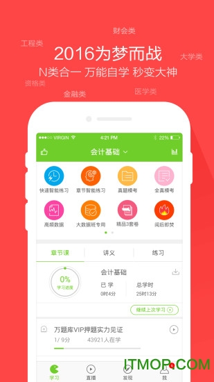 你一生用到的考试逆天相聚。全面锻造全面人才,金融类:基金从业、证券从业、银行从业、期货从业;财会类:会计从业、会计职称、注册会计师、经济师、税务师;工程类:一建、二建、造价、安全工程师、电气工程师、招标师、消防工程师;医学类:执业药师、执业医师、执业护士、卫生资格;资格类:职称英语、教师资格;大学类:英语四六级、考研、公务员、司法这些全都能自学!下载“万题库”,成就你的“麒麟之才”!
