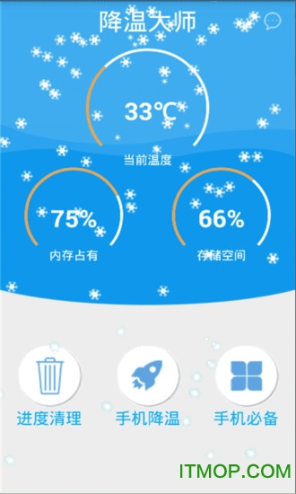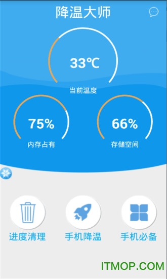 拍照摄影手机降温大师是一款手机降温工具。造成手机温度过高的原因一般是长时间浏览网页、玩游戏或后台驻留程序过多导致,降温大师通过对这些问题进行优化处理,有效降低手机温度,让您从此告别“暖手宝”。手机内程序太多、游戏过程死机、充电过程手机无法使用,不用担心,降温大师,为你保驾护航。喜欢的朋友赶紧来IT猫扑网下载体验吧!