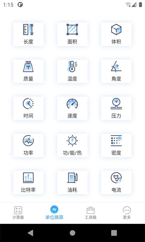 5、单位换算功能:温度换算,质量换算,长度换算,功率换算,能量换算,速度换算,面积换算,体积换算,时间换算