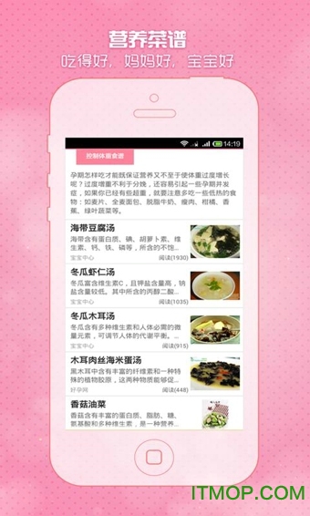 2.营养食谱:孕早期、孕中期、分娩前等孕期各个阶段的食谱;控制血糖、预防便秘、预防贫血等孕妈应对各种情况的食谱。