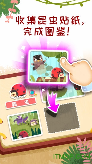 益智昆虫图鉴 ——宝宝认知昆虫外形! 成功找到昆虫,获得贴纸。宝宝根据昆虫外形,动手又动脑,完成拼图。拼图里面还有惊喜等宝宝发现哦!