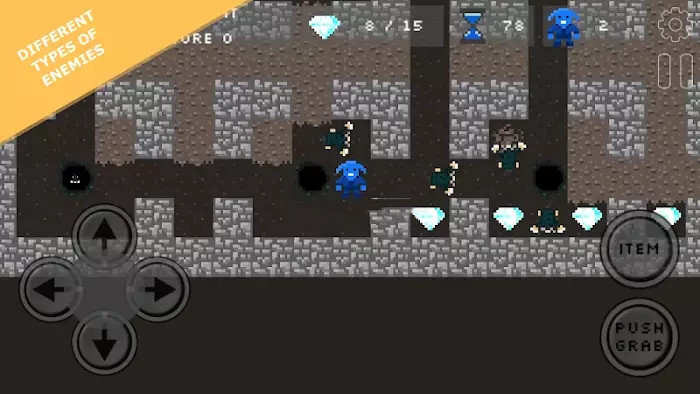 1、像素钻石洞穴里的玩家可以通过挖土得到钻石,打开地牢的出口,避免破碎的巨石;