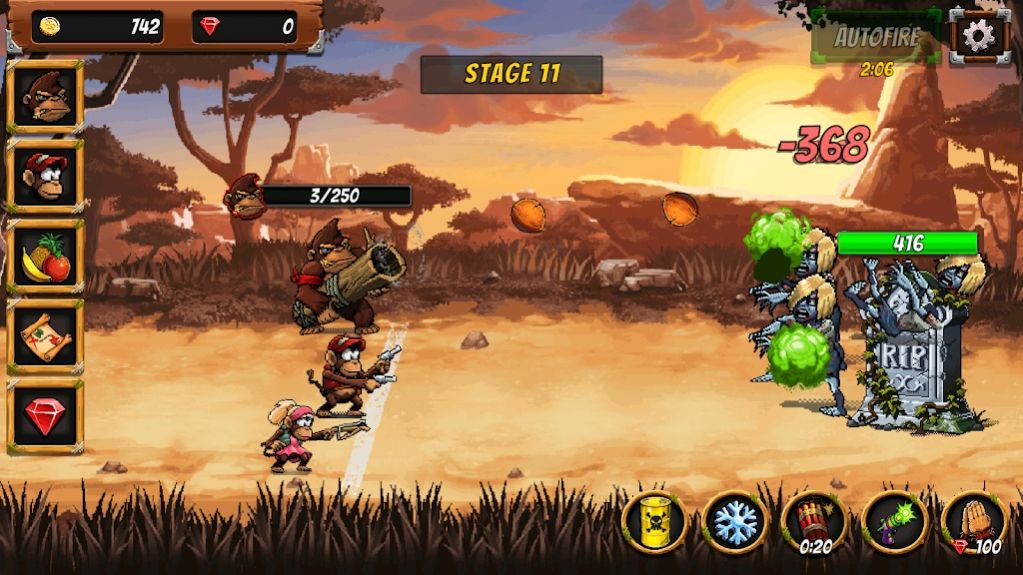 2、玩家要在不同关卡的场景中与众多僵尸作战,解锁大量猿猴角色;